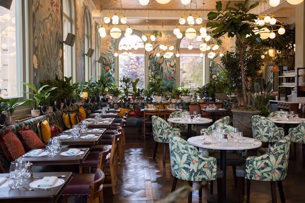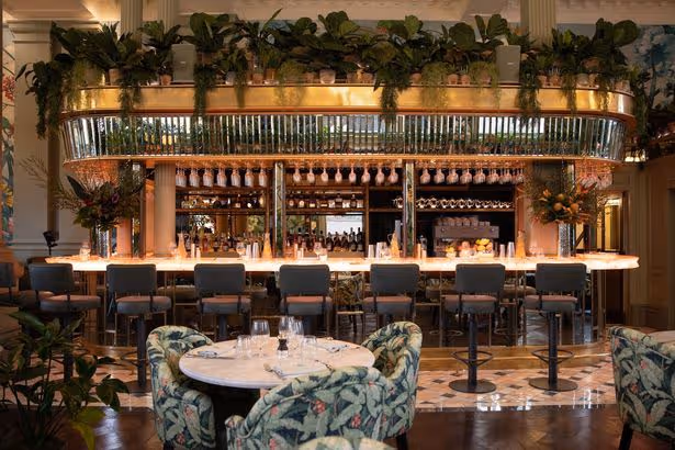 As expected, the interior delivers the unmistakable Ivy aesthetic. Think Roaring Twenties glamour turned up to full volume: gilded high ceilings, classic globe lighting, statement chandeliers, richly patterned botanical wallpaper, and a fully stocked bar lined with high stools. The main dining room features a mix of round tables and comfortable booth seating, creating a space that feels both grand and sociable.